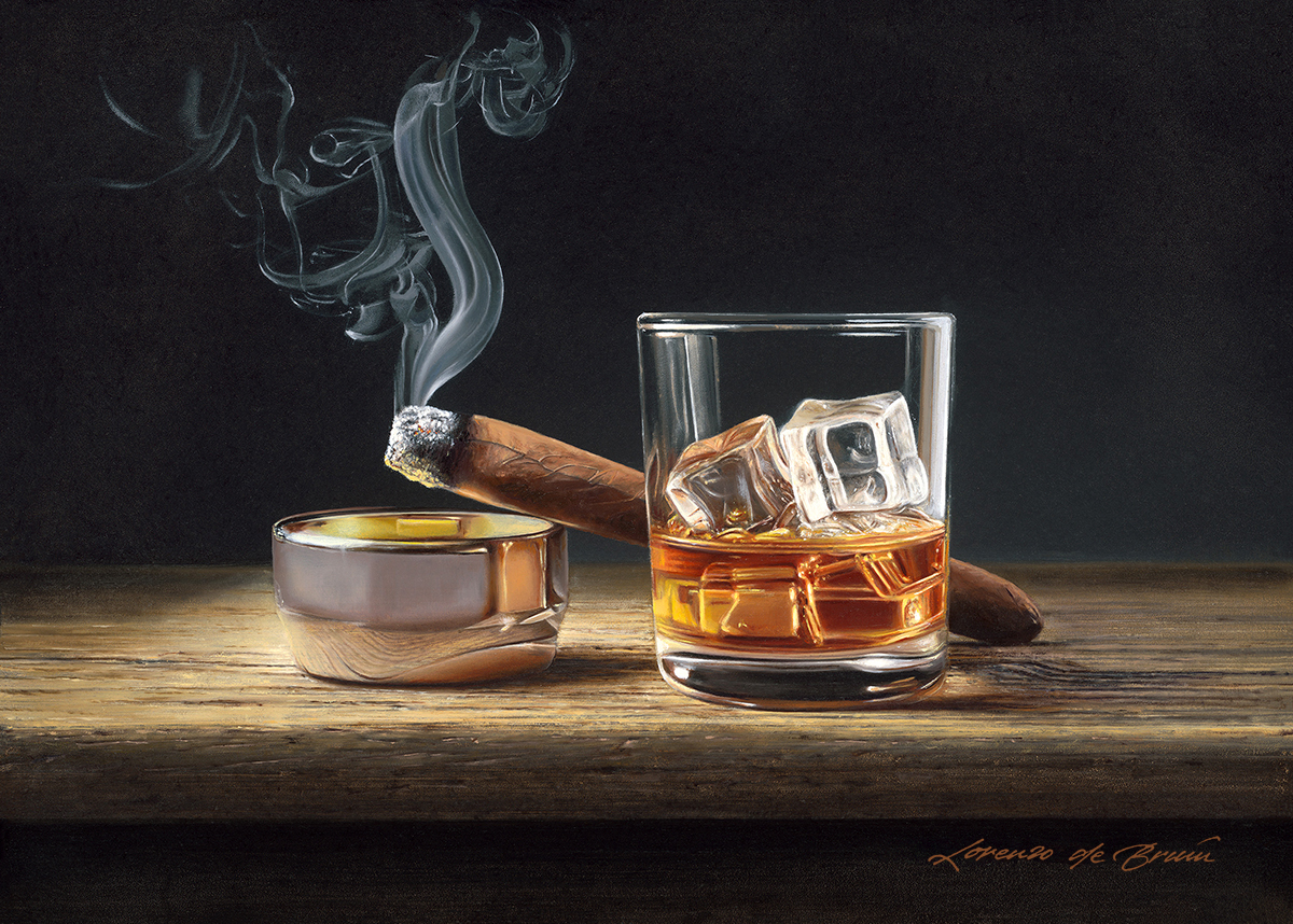 Guilty pleasure no.1, Whisky & CIgar 25 X 35 cm olieverf op paneel.